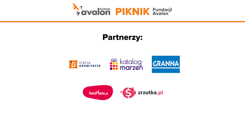 Partnerami Pikniku, którzy wspierają działania Fundacji Avalon podczas jego organizacji są firmy: FaniMani, Zrzutka.pl, Granna, Stacja Grawitacja, Katalog marzeń.