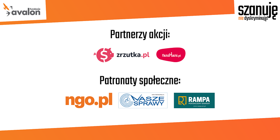 Do grona partnerów Miesiąca Walki z Dyskryminacją Osób z Niepełnosprawnościami Fundacji Avalon dołączyli Zrzutka.pl - platforma crowdfundingowa, która umożliwia łatwe i bezpośrednie przekazywanie darowizn oraz FaniMani.pl, czyli serwis pozwalający na generowanie darowizn przy zakupach online bez dodatkowych kosztów dla użytkowników. Łukasz Krasoń, Pełnomocnik Rządu do Spraw Osób Niepełnosprawnych, Sekretarz Stanu, objął akcję patronatem honorowym.
