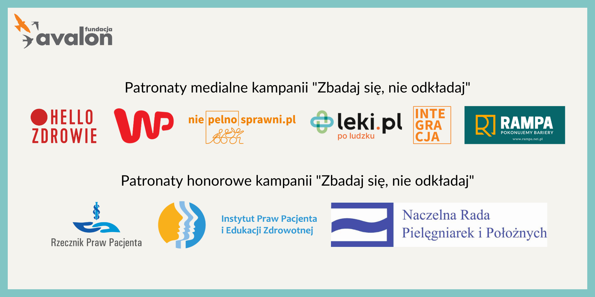 Patronat honorowy nad akcją “Zbadaj się nie odkładaj” objęli: Rzecznik Praw Pacjenta, Naczelna Rada Pielęgniarek i Położnych oraz Instytut Praw Pacjenta.